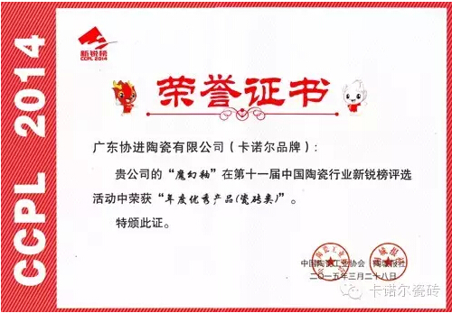 3月28日下午,由中国陶瓷工业协会与陶城报联合举办的高端论坛暨第十一届“中国陶瓷行业新锐榜”颁奖典礼在佛山新媒体产业园隆重举行。在本次活动中,中国陶瓷一线品牌卡诺尔瓷砖“魔幻釉”凭自身过硬的综合实力,在众陶瓷产品中脱颖而出,荣获“年度优秀产品”称号。