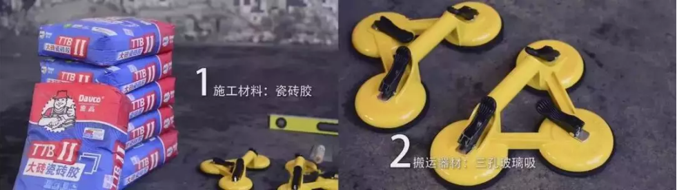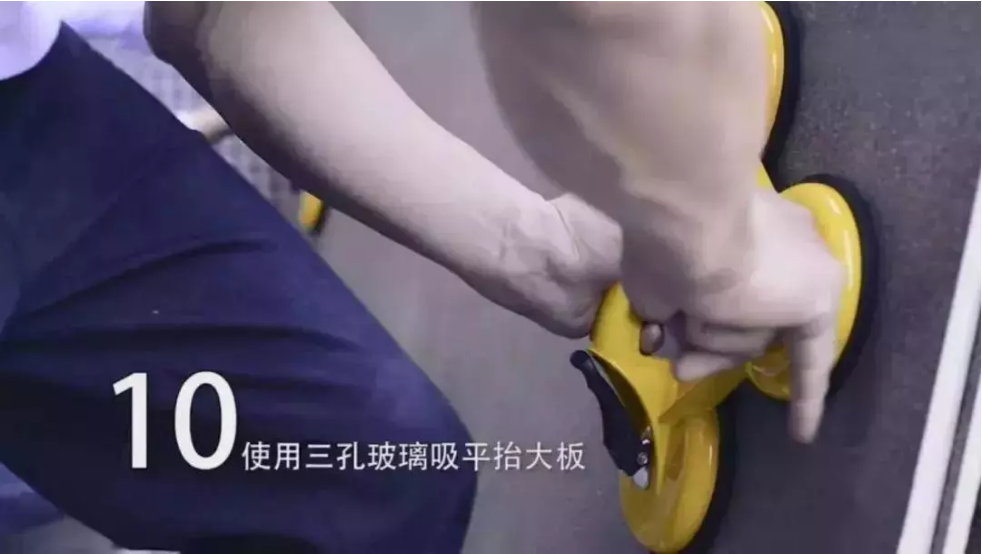 用三孔玻璃吸工具平抬大板平移施工位置,放置到铺好瓷砖胶的基面上,至少需要2名工人进行搬运;面积更大的使用移动架搬运。