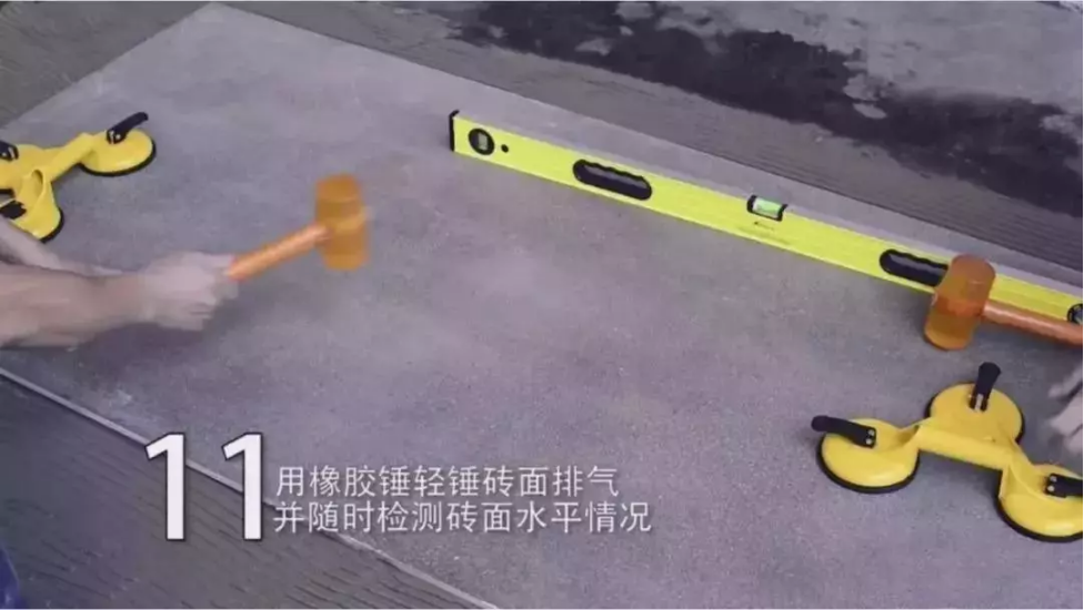 将瓷砖平整地铺贴在基层上,使用橡胶锤将瓷砖拍实铺平,便于排出气泡,轻敲砖面,让砖底能全面吃浆,以免产生空鼓现象。用木锤把砖面敲平整的同时,以靠尺测量,确保瓷砖铺贴水平。