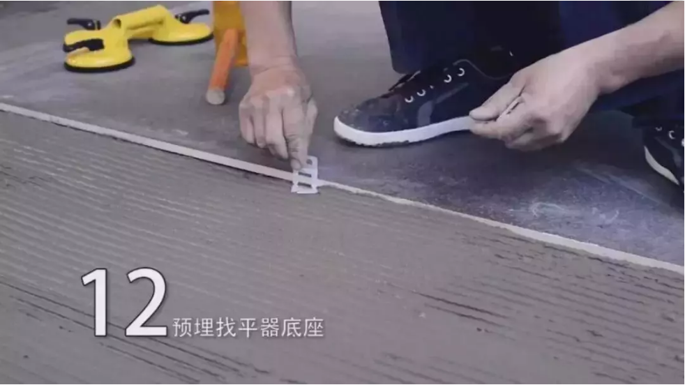 在已定位好的大板边缘周围每60cm左右插入找平器底座,检验平整后插入找平楔子并夹紧找平器,调节相邻大板的表面平整度,并将大板间隙调整为2mm左右,以便后续美缝剂处理。