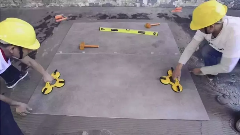 用三孔玻璃吸工具平抬大板平移施工位置,放置到铺好瓷砖胶的基面上,至少需要2名工人进行搬运;面积更大的使用移动架搬运。